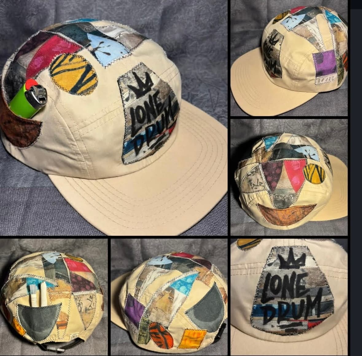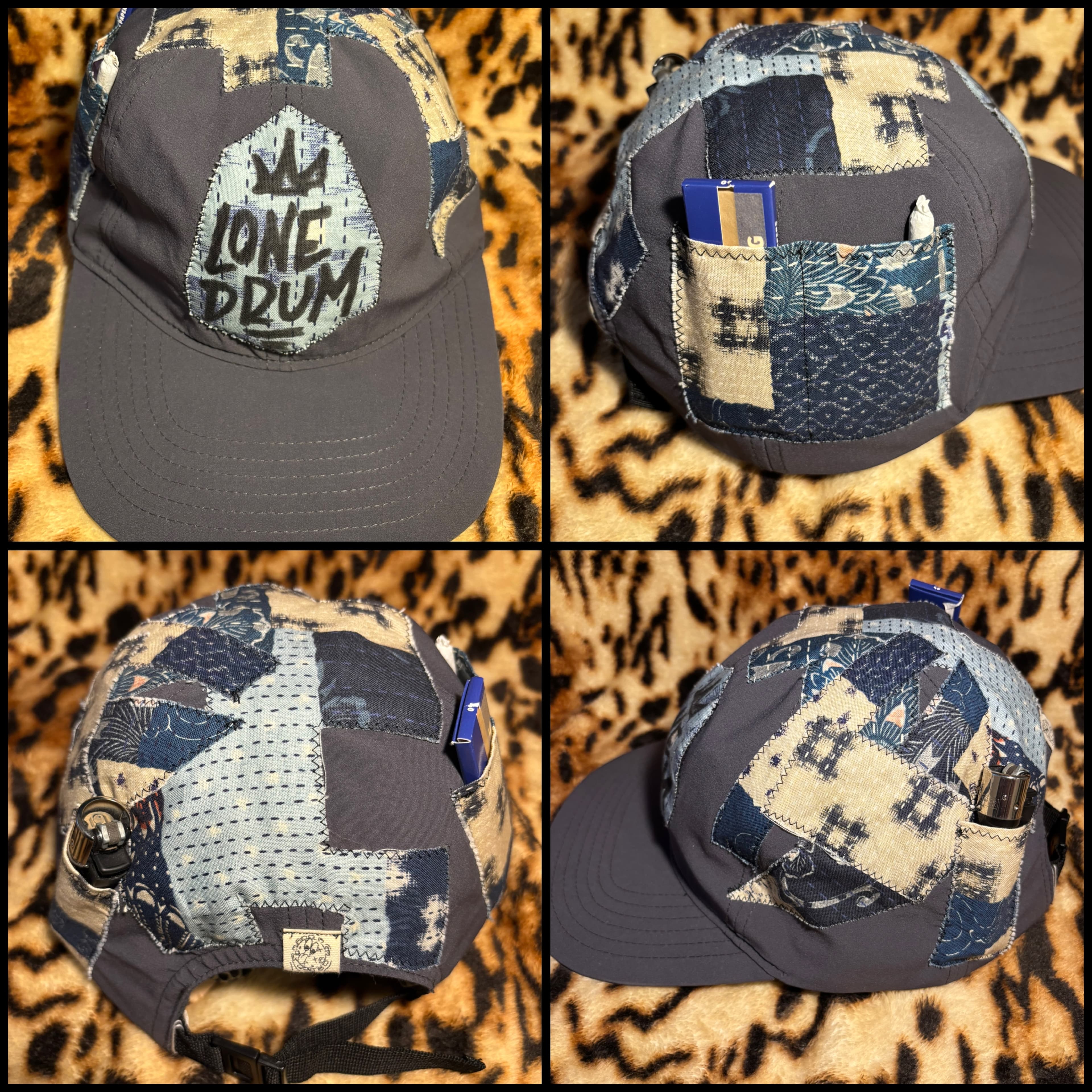 Collab with Lone Drum. Hand-pieced vintage floral upholstery cotton over a cream corduroy base, tan split-leather brim, hand-lettered back panel. Small run — numbered inside.